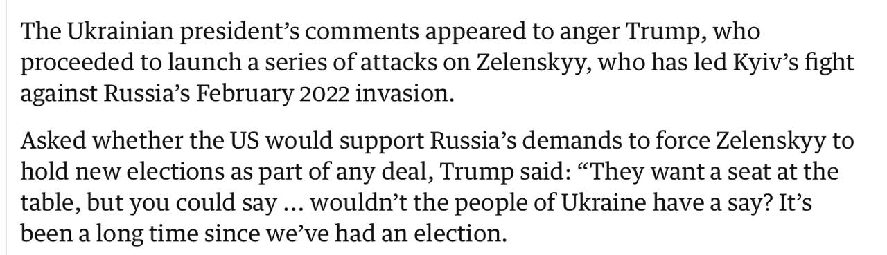 Нагадаємо, американський президент заявив, що Київ сам винен на початку війни, дорікнув Зеленському в небажанні вести переговори і закликав його провести вибори, заявляючи, що має низький рейтинг у районі 4%. І що Зеленський, на думку Трампа, із таким рейтингом не може представляти Україну за столом переговорів.