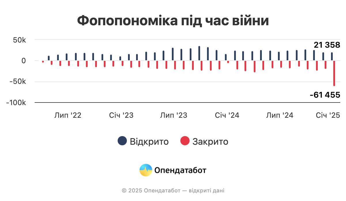 За даними YS Market, за січень 2025 року припинили діяльність 59,4 тисяч фізосіб-підприємців, тоді як новий бізнес зареєстрували лише 21,4 тисяч.