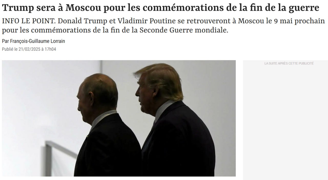 "9 травня 2025 року, якщо нова угода між США і Росією буде укладена і ніщо не завадить її виконанню, європейці символічно вип'ють чашу до дна, спостерігаючи на своїх екранах парад російських військ, що вітає американського президента", – сказано в публікації журналу.