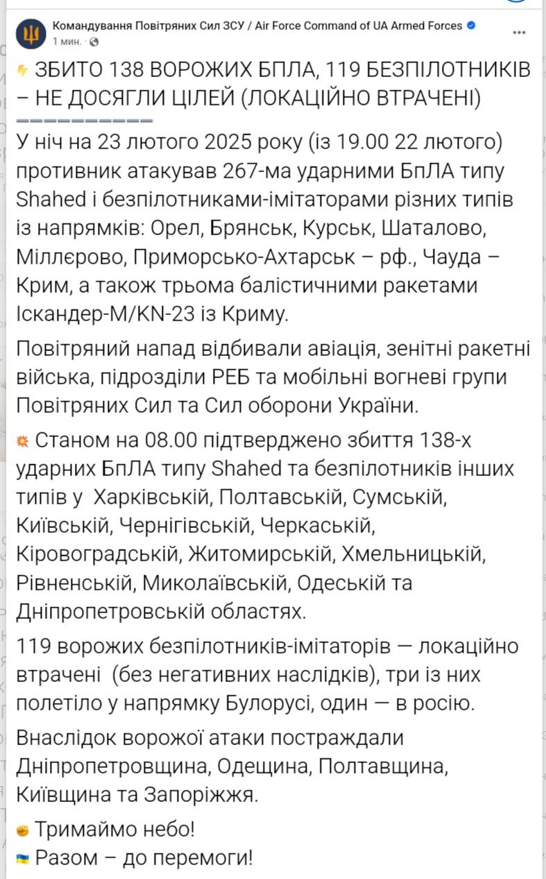 ВСУ повідомляють, що 138 із них збили, а 119 "локаційно втрачено".