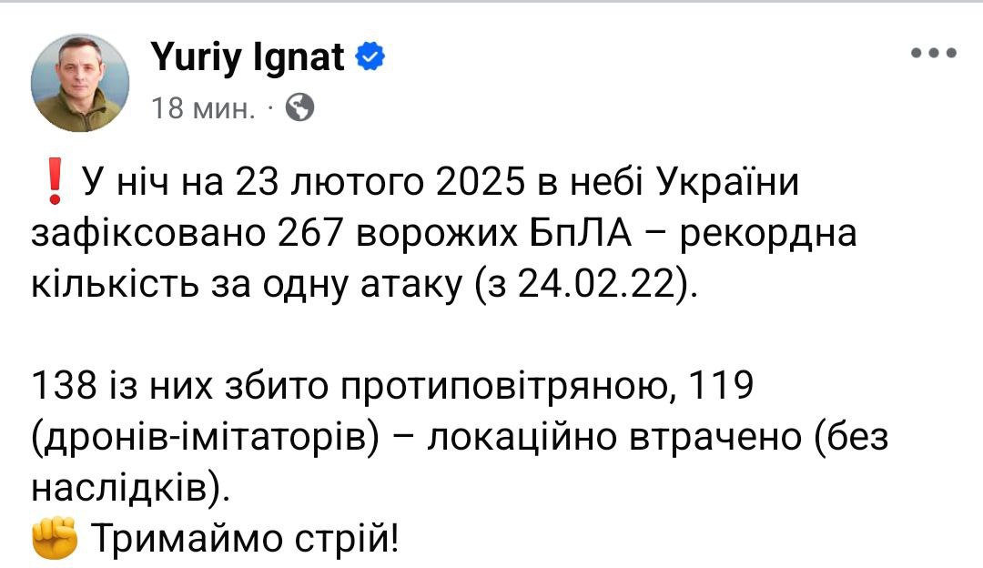 08:28 Вночі Україну атакували одразу 267 безпілотників різних типів. Деякі військові паблики пишуть, що це рекордна кількість.