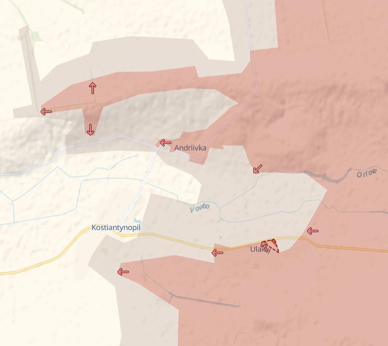 Військовий оглядач Мірошников зазначає, що одночасно росіяни просуваються в районі села Розлив, щоб обійти та затиснути Константинополь із заходу та оформити оперативне оточення.
