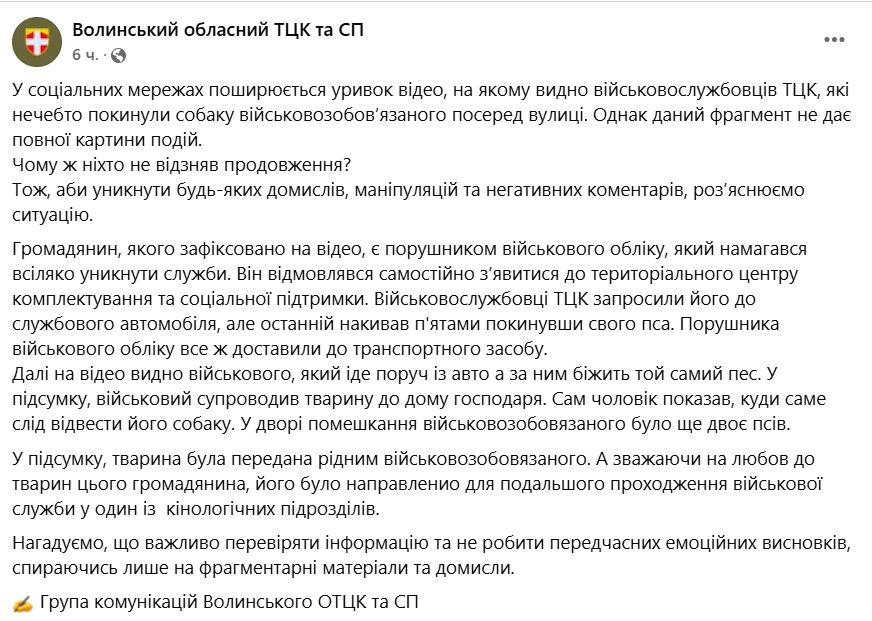 Також у повідомленні ТЦК йдеться, що собаку потім військкоми відвели до родичів чоловіка. Але на відео видно, що її просто залишили на вулиці, і вона побігла за бусом, куди "запакували" її господаря.