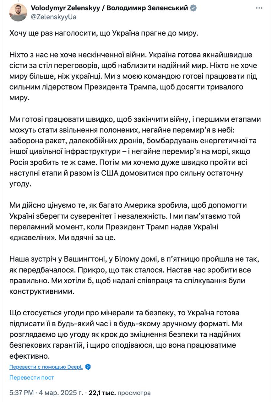 "Наша зустріч у Білому домі в п'ятницю пройшла не так, як мала. Школю, що це сталося. Час все виправити", - написав Зеленський, додавши, що готовий працювати під "сильним керівництвом президента Трампа" для досягнення миру в Україні.