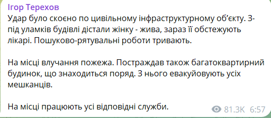 Також був приліт по об'єкту інфраструктури в Харкові, повідомляє мер міста Ігор Терехов.
