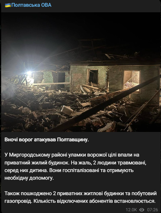 У Миргородському районі уламки ворожої мети впали на приватний житловий будинок. На жаль, 2 людей травмовано, серед них дитина, повідомляє ОВА.