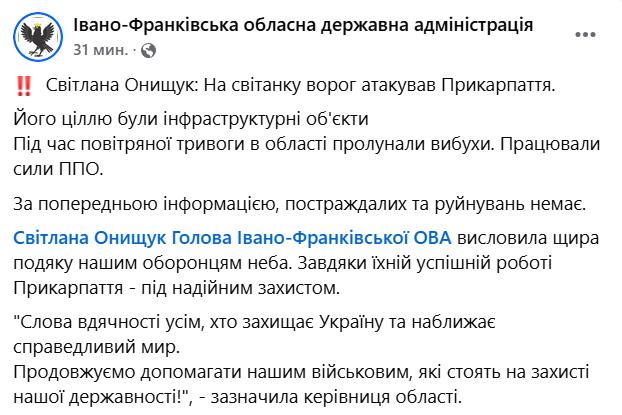 Вибухи вночі лунали на Івано-Франківщині, атаковані об'єкти інфраструктури.