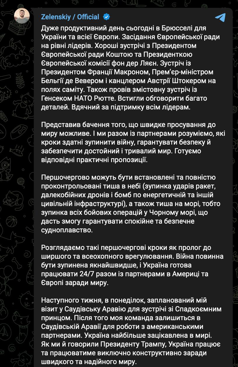 "Наступного тижня у понеділок заплановано мій візит до Саудівської Аравії для зустрічі з Наслідним принцом. Після цього моя команда залишиться в Саудівській Аравії для роботи з американськими партнерами. Україна найбільше зацікавлена у світі", - сказав український президент.