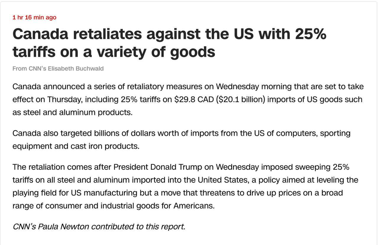 Канадська влада вирішила ввести мито у розмірі 25% на імпорт деяких американських товарів у відповідь на введені президентом США Дональдом Трампом 25% мита на сталь і алюміній з Канади.