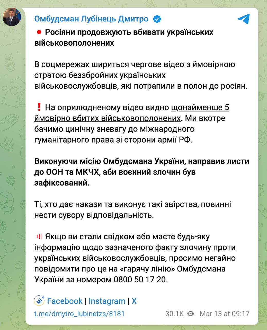 10:50 Омбудсмен Дмитро Лубинець заявляє, що росіяни на Курщині розстріляли українських військовополонених.