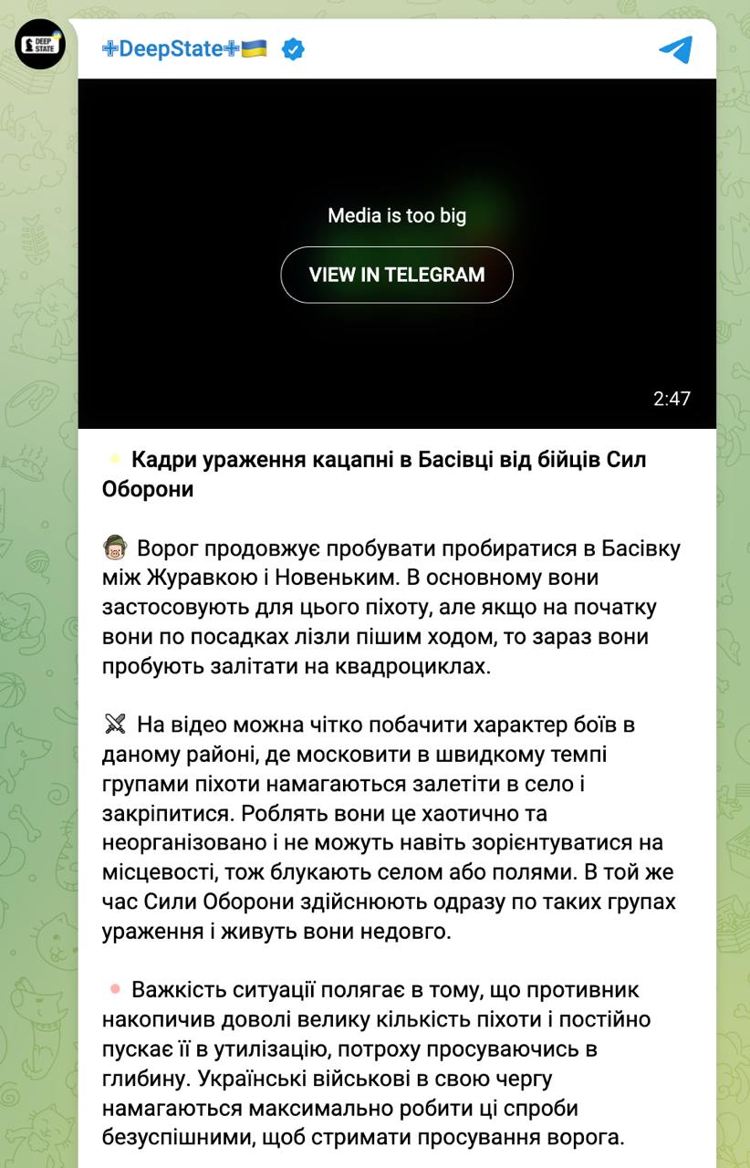 "Ворог продовжує пробувати пробиратися до Басівки між Журавкою та Новеньким. В основному вони застосовують для цього піхоту, але якщо спочатку вони по посадках лізли пішою ходою, то зараз вони пробують залітати на квадроциклах", - повідомляє український військовий паблік.