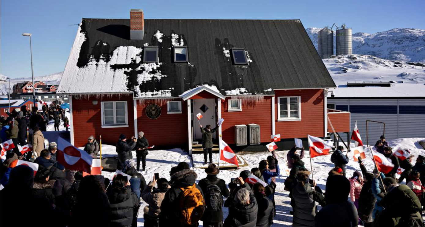 До лідера партії "Демократичні рубежі", яка перемогла на парламентських виборах цього тижня, Йєнсу-Фредеріку Нільсену приєднався прем'єр-міністр Муті Б. Егеде, що йде, щоб повести протестувальників до консульства США на околиці Нуука.