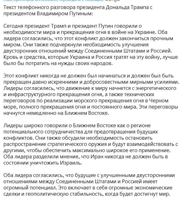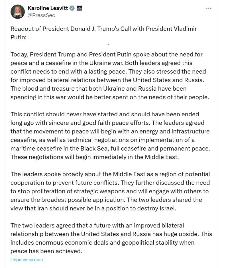 "Сьогодні президент Трамп і президент Путін обговорили необхідність миру і припинення вогню у війні в Україні. Обидва лідери погодилися з тим, що цей конфлікт має закінчитися міцним світом. Вони також наголосили на необхідності покращення двосторонніх відносин між США та Росією. Кров і ресурси, які Україна і Росія витрачають на цю війну, краще спрямувати на потреби".