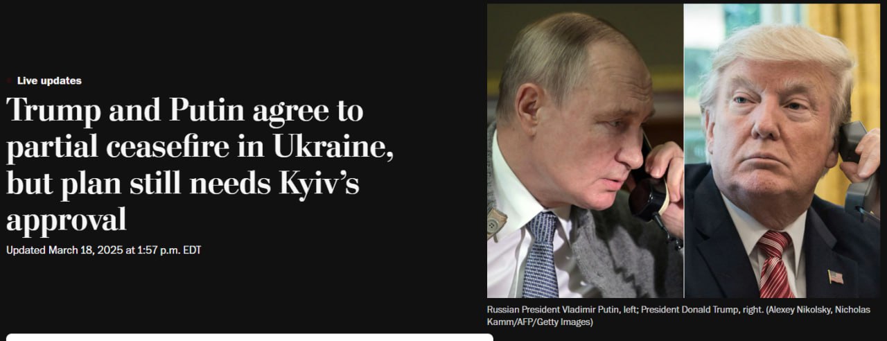 Видання зазначає, що Дональд Трамп та Володимир Путін домовилися про часткове припинення вогню в Україні, досягнувши угоди під час тривалої телефонної розмови про припинення ударів по енергетичній та інфраструктурній мережі після більш ніж трьох років бойових дій.