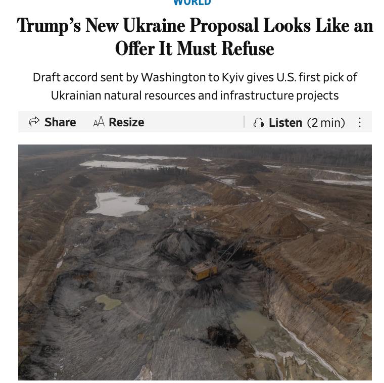 WSJ підтверджує, що запропонований американцями новий варіант договору вкрай жорсткий щодо Києва. І "спрямований на виконання вимог Трампа повернути мільярди військової та фінансової допомоги від України".