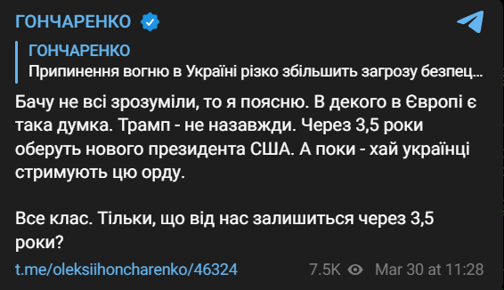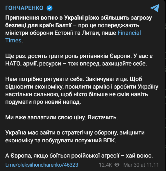 "Ще раз: досить грати роль рятівників Європи. У вас є НАТО, армії, ресурси – тож вперед, захищайте себе. Нам потрібно рятувати себе. Закінчувати це. Щоб відновити економіку, посилити армію і зробити Україну настільки сильною, щоб ніхто більше не смів навіть подумати про новий напад. Ми вже заплатили свою ціну. Вистачить. Україна має зайти в стратегічну оборону, зміцнити економіку та побудувати потужний ВПК. А Європа, якщо боїться російської агресії – хай воює. Бачу не всі зрозуміли, то я поясню. В декого в Європі є така думка. Трамп - не назавжди. Через 3,5 роки оберуть нового президента США. А поки - хай українці стримують цю орду. Все клас. Тільки, що від нас залишиться через 3,5 роки?" - написав він.