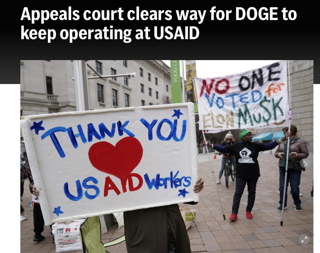 Департаменту Маска вдалося скасувати в апеляції рішення суду нижчої інстанції, які заблокували роботу зі скорочення в USAID. Рішення ґрунтувалося на заяві Маска, що він "годував USAID у подрібнювач деревини" (у цьому суд побачив упередженість мільярдера). Проте апеляція зняла блокування.