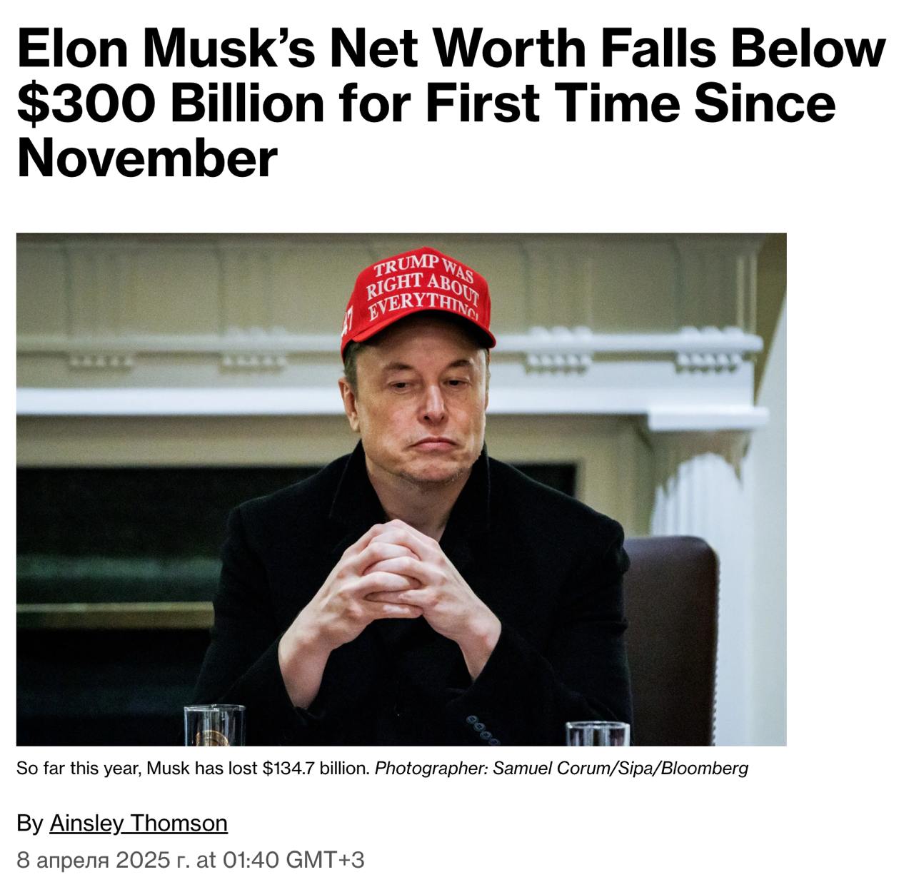 У Bloomberg зазначають, що через тарифи статки голови Tesla вперше з листопада опустилися нижче 300 мільярдів доларів.