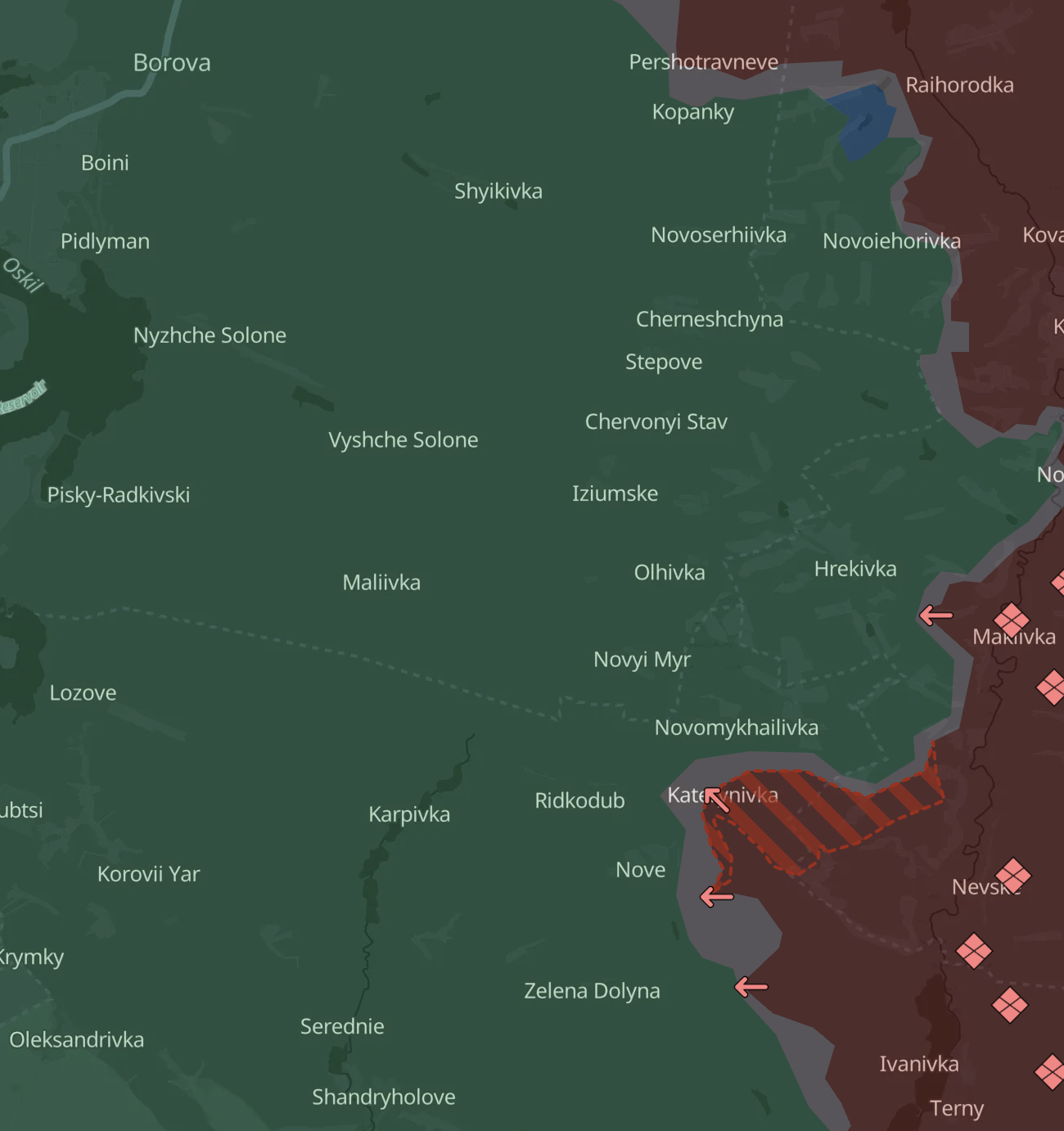 Армія РФ розвиває наступ на лимансько-оскольському фронті у Харківській та Луганській областях. Карта українського військового паблику DeepState показує, що росіяни просунулися в Катеринівці і наступають у бік Борової.
