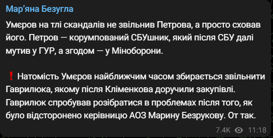 Народний депутат Мар'яна Безуглая пише, що насправді Гаврилюка "видавлюють" з міністерства через скандали із закупівлями, після того, як він "спробував розібратися в проблемах" після усунення голови Агентства оборонних закупівель Марини Безрукової.