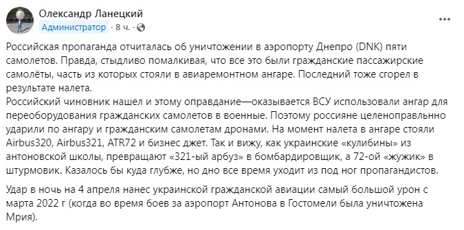 Також Ланецький повідомляє, що влітку 2023 року внаслідок ракетного обстрілу аеропорту Жуляни (Київ) було пошкоджено 2 Airbus 320 однієї з українських авіакомпаній.