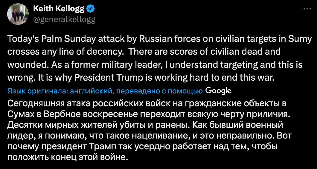 "Сьогоднішня атака російських військ на цивільні об'єкти в Сумах у Вербну неділю переходить будь-яку межу пристойності. Десятки мирних жителів убиті і поранені. Як колишній військовий лідер, я розумію, що таке націлювання, і це неправильно. Ось чому президент Трамп так старанно працює над тим, щоб покласти край цій війні".