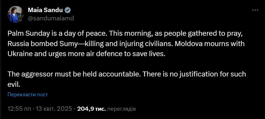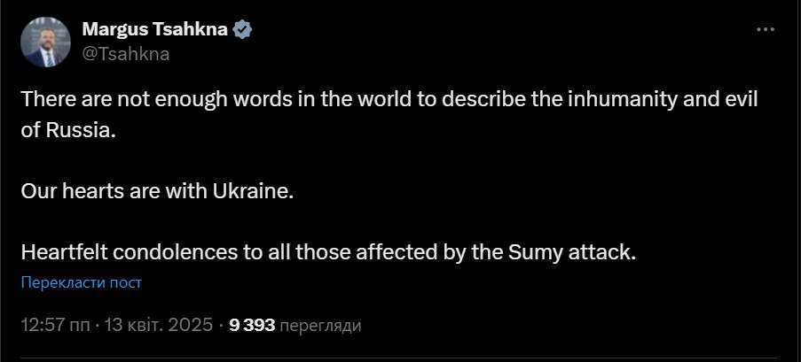 Інші світові лідери також відреагували на обстріл міста Суми. Співчуття висловили президенти Литви Гітанас Науседа та Молдови Майя Санду, а також глава МЗС Естонії Маргус Тсахкна.
