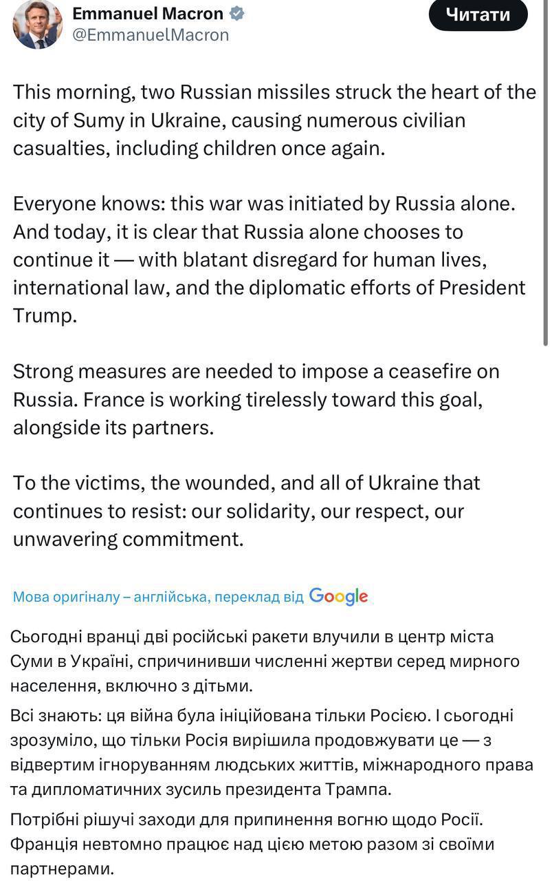 Президент Франції Емманюель Макрон та голова євродипломатії Кая Каллас засудили сьогоднішній російський удар балістичними ракетами по Сумах, внаслідок якого загинуло понад 30 людей.