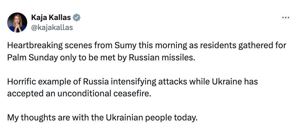 "Шалені сцени в Сумах сьогодні вранці, коли жителі зібралися на Вербну неділю, але їх зустріли російські ракети. Мої думки сьогодні з українським народом", - написала Каллас у X.