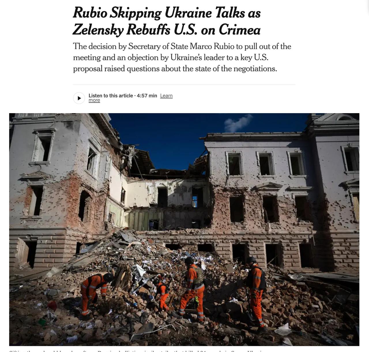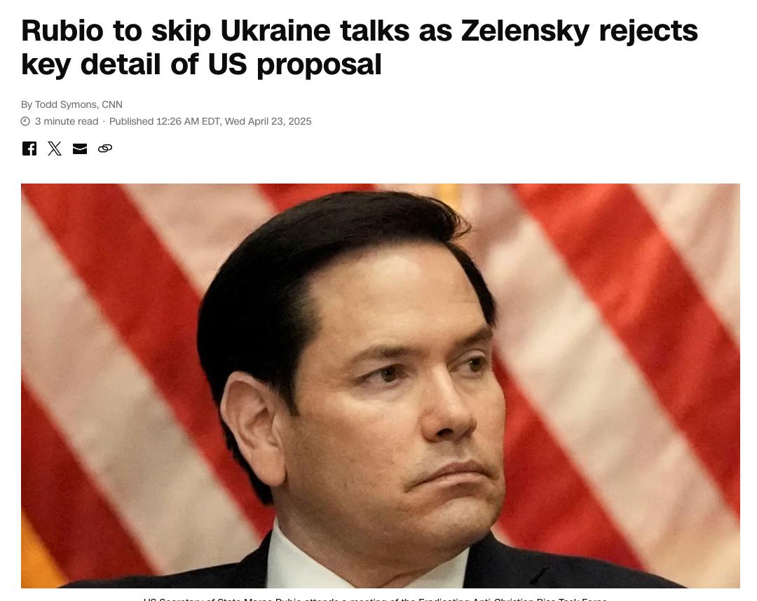 Держсекретар США Марко Рубіо не поїхав до Лондона на переговори з Україною, бо український президент Володимир Зеленський відкинув пропозиції США щодо Криму.