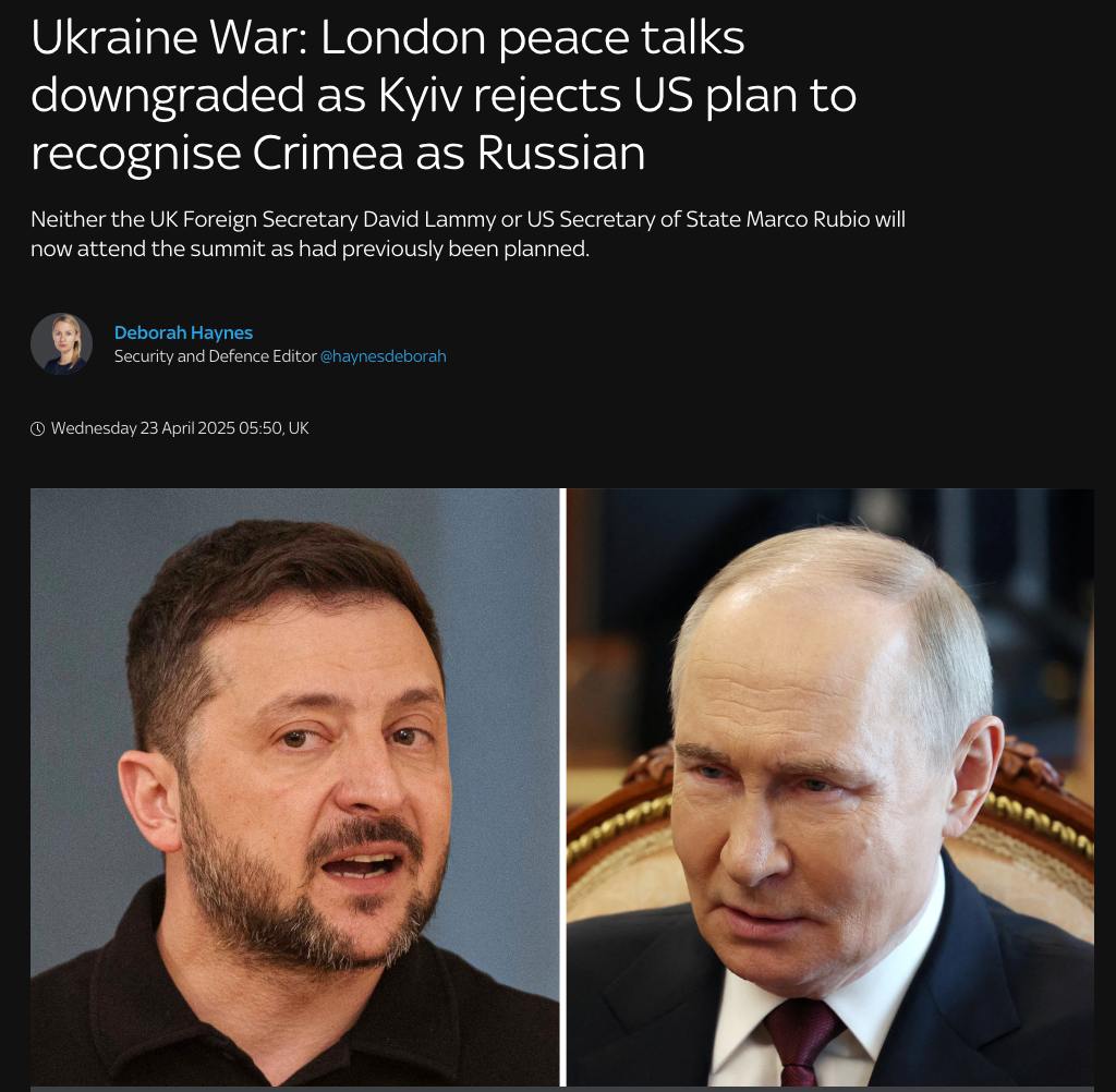 "Мирна пропозиція США, яка має обговорюватися в Лондоні, передбачає, що Сполучені Штати визнають незаконну анексію Криму Росією, що було відкинуто Володимиром Зеленським у вівторок", - йдеться в огляді Sky News.
