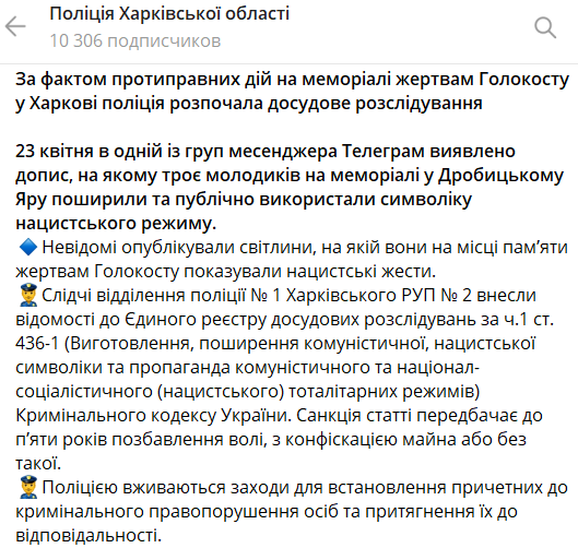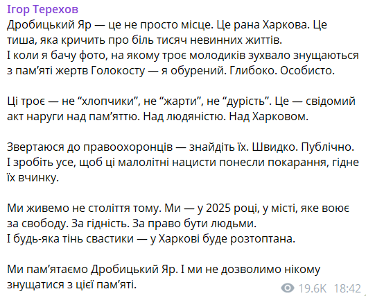 "Ці троє - не "хлопчики", не "жарти", не "дурість". Звертаюся до правоохоронців - знайдіть їх", - прокоментував ситуацію у своєму телеграм-каналі мер Харкова Ігор Терехов.