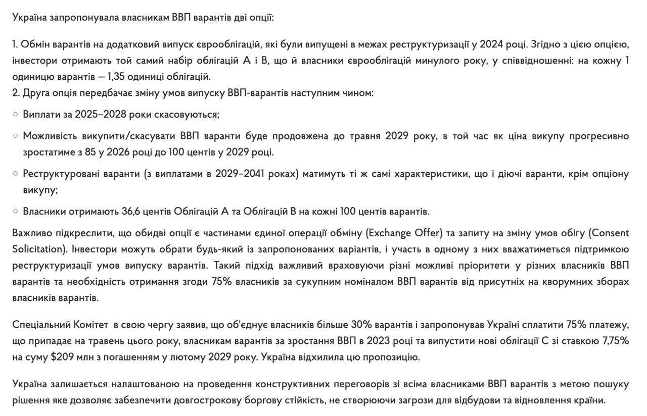 Мінфін запропонував власникам близько 30% ВВП варантів обміняти їх на додатковий випуск єврооблігацій, випущених у рамках реструктуризації у 2024 році, або змінити умови випуску ВВП-варрантів, скасувавши виплати за 2025–2028 роки та продовжити можливість їх викупу чи скасування до травня 2029 року.