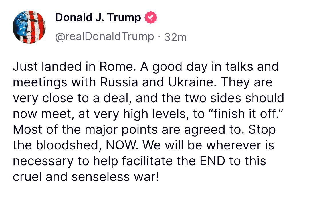 "Зупиніть кровопролиття, ЗАРАЗ. Ми будемо там, де буде потрібно, щоб допомогти покласти КІНЕЦЬ цій жорстокій і безглуздій війні!" – додав Трамп.