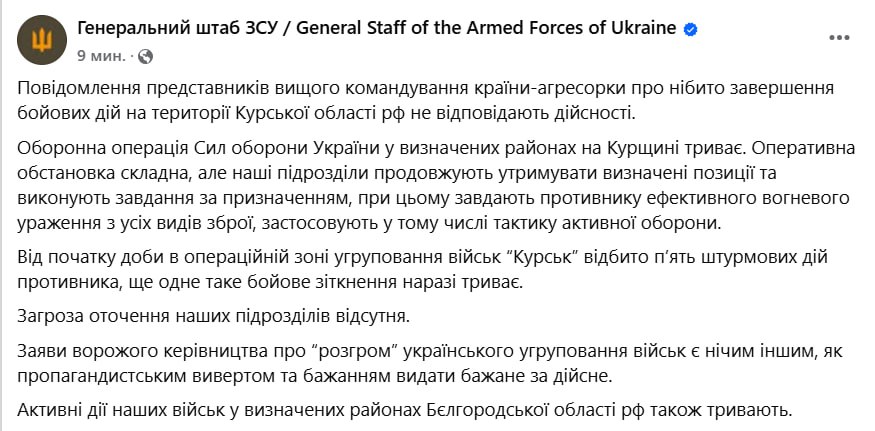 "Операція Сил оборони України у певних районах Курської області триває. Активні дії наших військ у певних районах Білгородської області РФ також продовжуються", - йдеться у повідомленні.