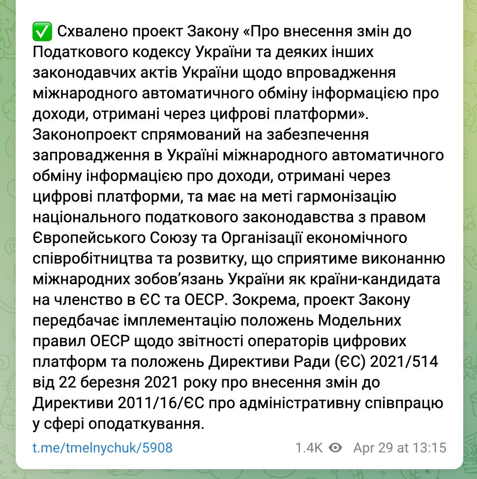 Про це повідомляє представник уряду у парламенті Тарас Мельничук у своєму телеграм-каналі.