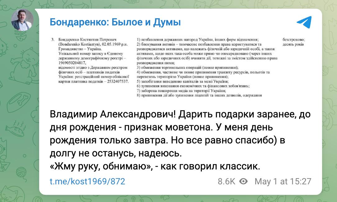 "Володимире Олександровичу! Дарувати подарунки заздалегідь, до дня народження - ознака моветона. У мене день народження тільки завтра. Але все одно дякую, в боргу не залишуся, сподіваюся. "Тискаю руку, обіймаю", як казав класик", - написав Бондаренко.