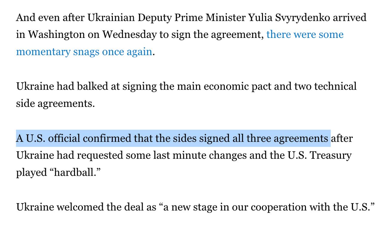 "Представник США підтвердив, що сторони підписали всі три угоди після того, як Україна в останній момент запросила деякі зміни, а Міністерство фінансів США зайняло жорстку позицію", - йдеться у статті.