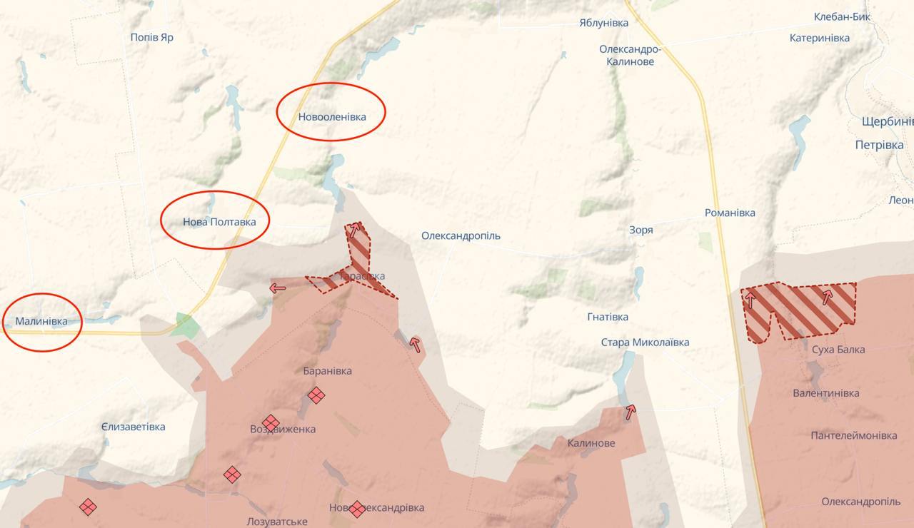 РФ захопила Тарасівку, намагається заходити до Новооленівки на північ і вже заходила до Нової Полтавки по той бік траси. Не виключено, що окремим солдатам там вдалося закріпитися, хоча багато хто здався в полон.