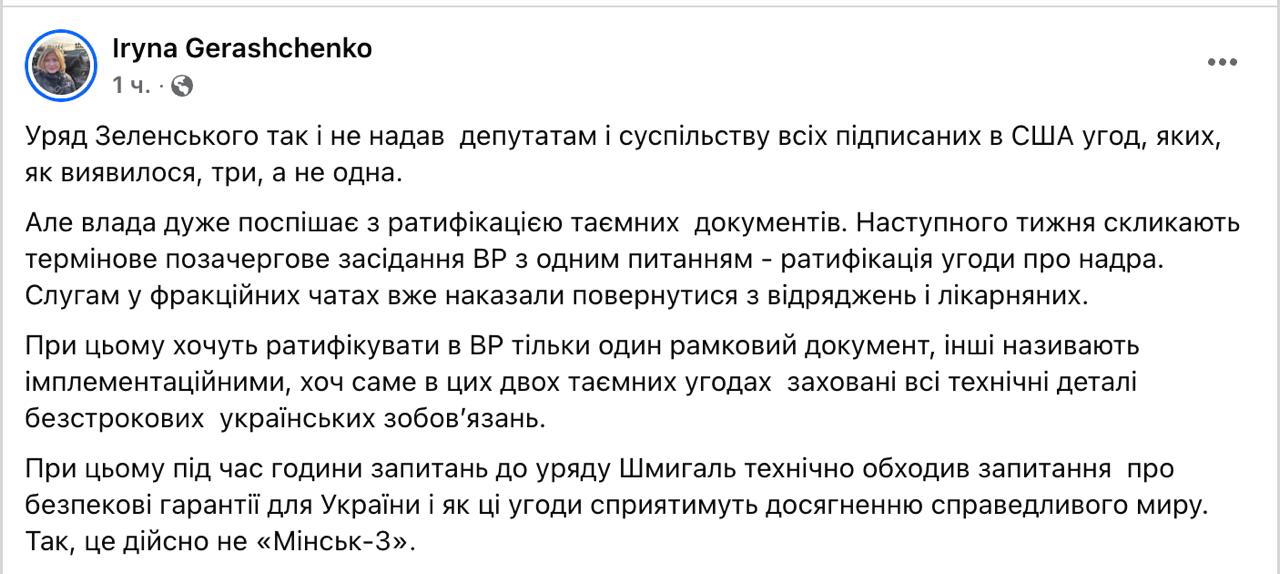 "Уряд Зеленського так і не надав депутатам і суспільству всі підписані в США угоди, яких, як виявилося, три, а не одна. Але влада дуже поспішає з ратифікацією таємних документів. При цьому хочуть ратифікувати у ВР тільки один рамковий документ, інші називають імплементаційними, хоч саме у цих двох таємних угодах заховано всі технічні деталі безстрокових українських зобов'язань", - пише Геращенко.