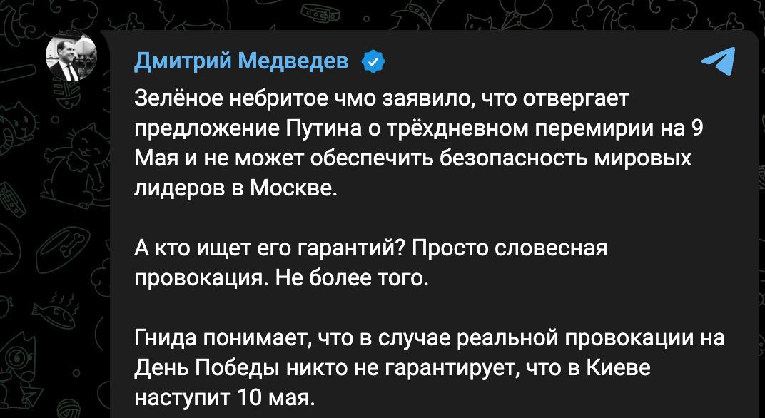 Таким чином, заступник голови Ради безпеки РФ прокоментував заяву президента України Володимира Зеленського, в якій він відкинув пропозицію лідера РФ Володимира Путіна про перемир'я, а також заявив, що не може гарантувати безпеку світових лідерів у Москві під час військового параду.