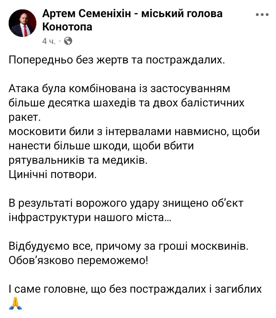 7.49 У Конотопі Сумської області знищено об'єкт інфраструктури.