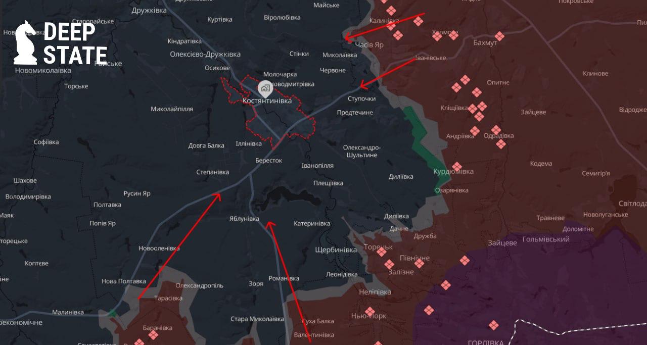 Також наростає загроза виходу РФ на захід від Костянтинівки, якщо темпи просування росіян збережуться в районі Сухої Балки та Новооленівки.