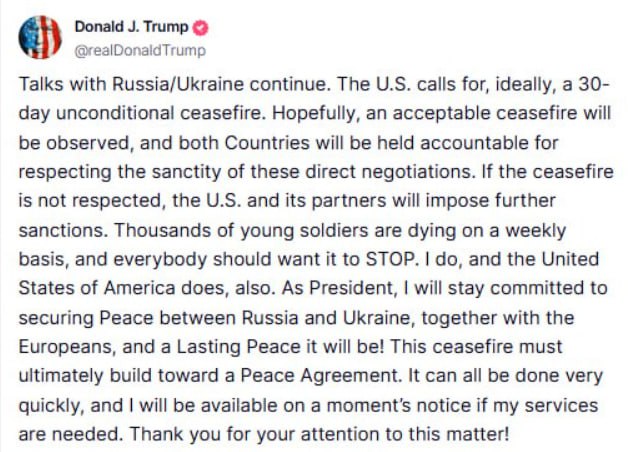 "Переговори з Росією та Україною продовжуються. США закликають до, в ідеалі, 30-денного безумовного припинення вогню", - написав президент США.