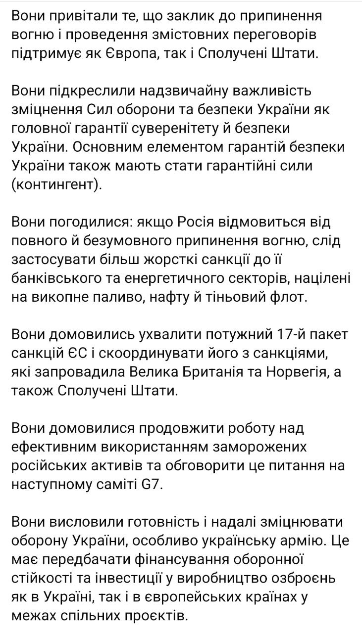 Президент України Володимир Зеленський опублікував спільну заяву після візиту до Києва президента Франції Емманюеля Макрона, прем'єр-міністра Великобританії Кіра Стармера, канцлера ФРН Фрідріха Мерца та прем'єр-міністра Польщі Дональда Туска.