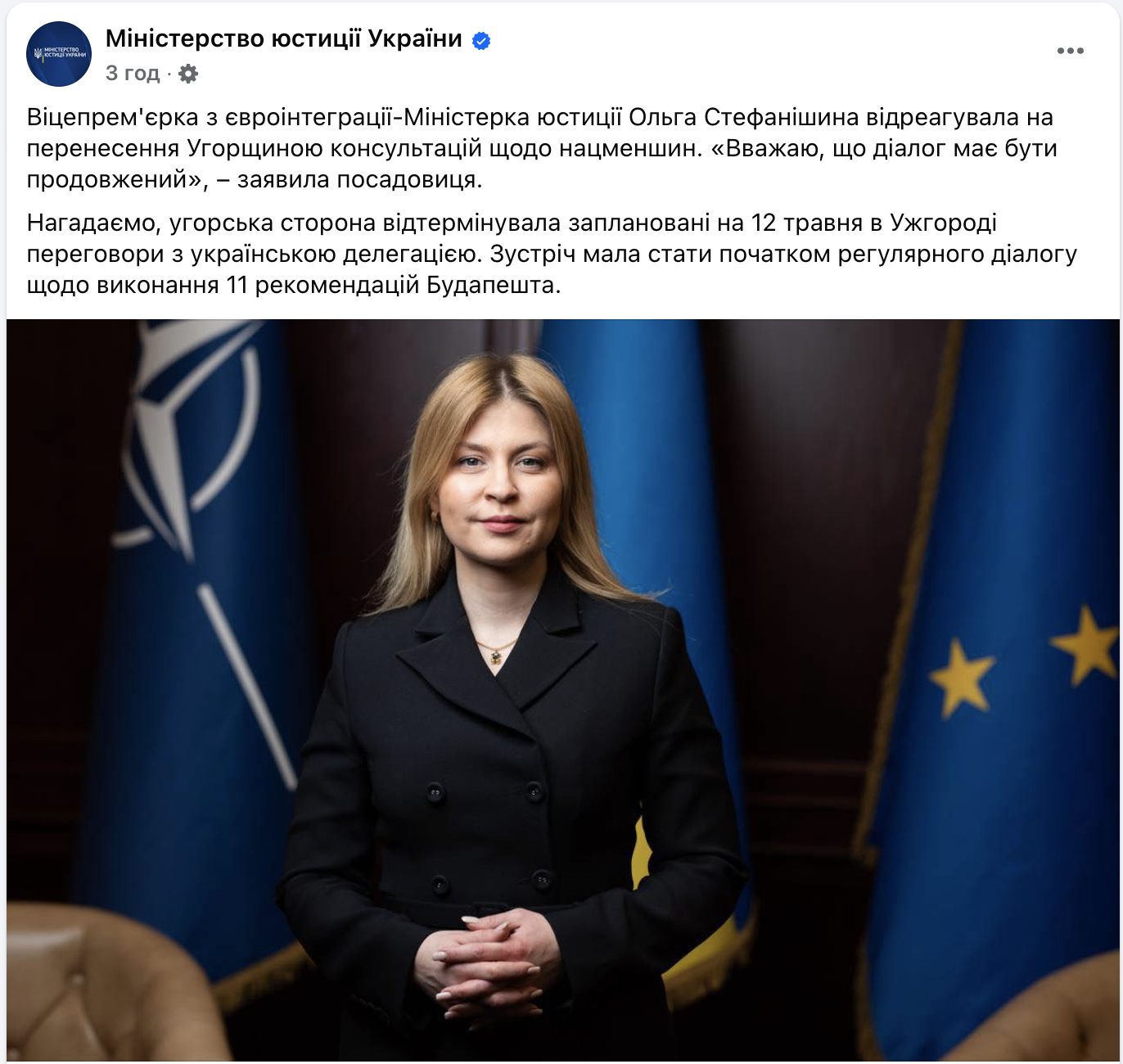 Віце-прем'єр з євроінтеграції-міністр юстиції Ольга Стефанішина відреагувала на перенесення Угорщиною консультацій щодо нацменшин.