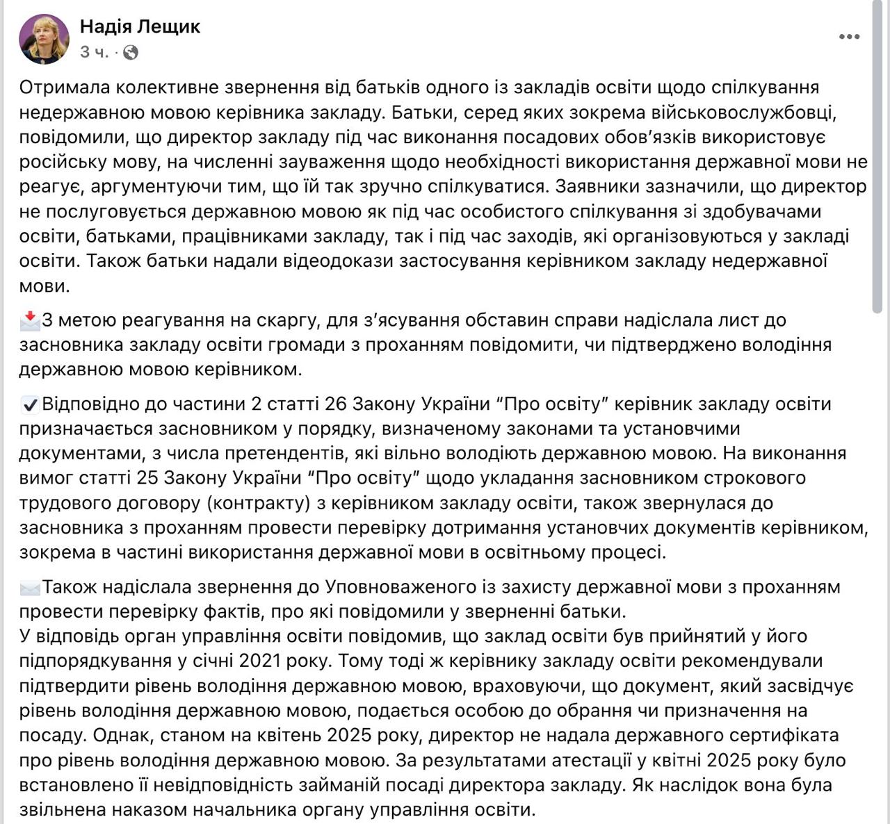 За її словами, вона отримала колективне звернення від батьків однієї з закладів освіти щодо спілкування російською мовою керівника закладу. Батьки, серед яких є військовослужбовці, повідомили, що директор під час виконання посадових обов'язків використовує російську мову, а на численні зауваження щодо необхідності використання української мови не реагує, аргументуючи це тим, що їй так зручно спілкуватися. Заявники зазначили, що директор не користується державною мовою ні під час особистого спілкування з дітьми, батьками та співробітниками, ні під час заходів, що організуються в навчальному закладі. Батьки надали відеодокази про застосування директором російської мови.