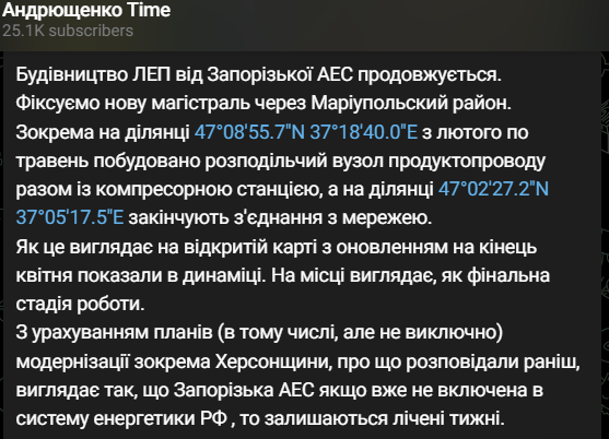 Раніше Андрющенко повідомив, що росіяни будують високовольтні лінії електропередач із Ростовської області у Запорізьку АЕС.