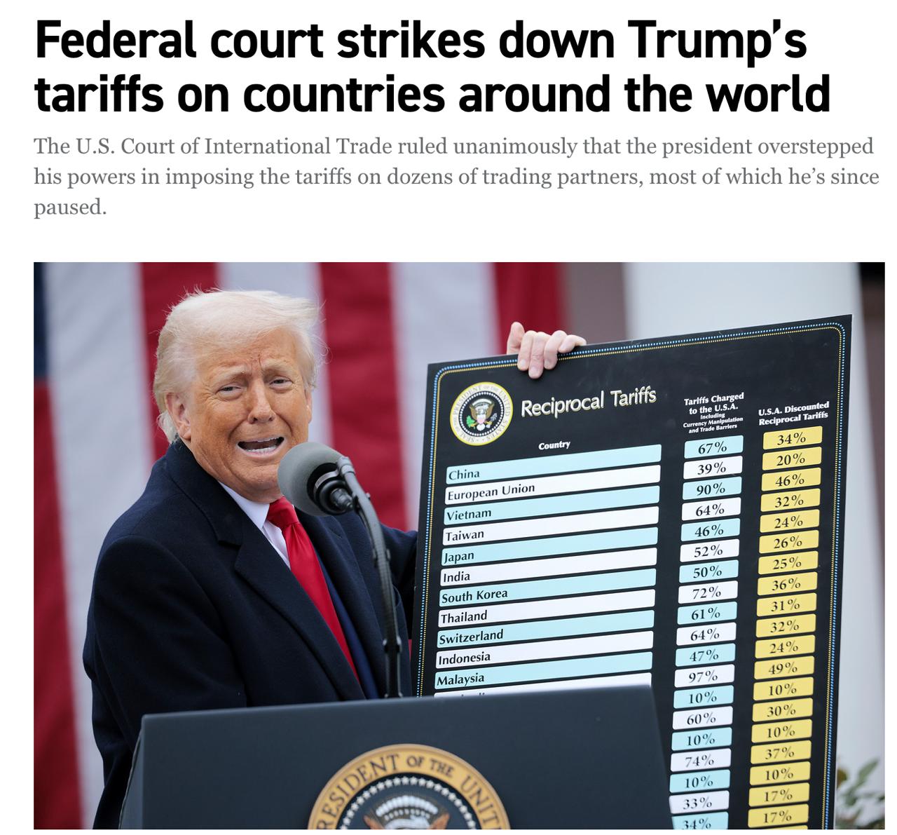 Незаконними визнані й "взаємні" тарифи у розмірі від 20 до 50 відсотків для 60 із лишком торгових партнерів, які мають набути чинності 9 липня - якщо іноземні уряди не зможуть досягти угоди з Білим домом до цього часу.