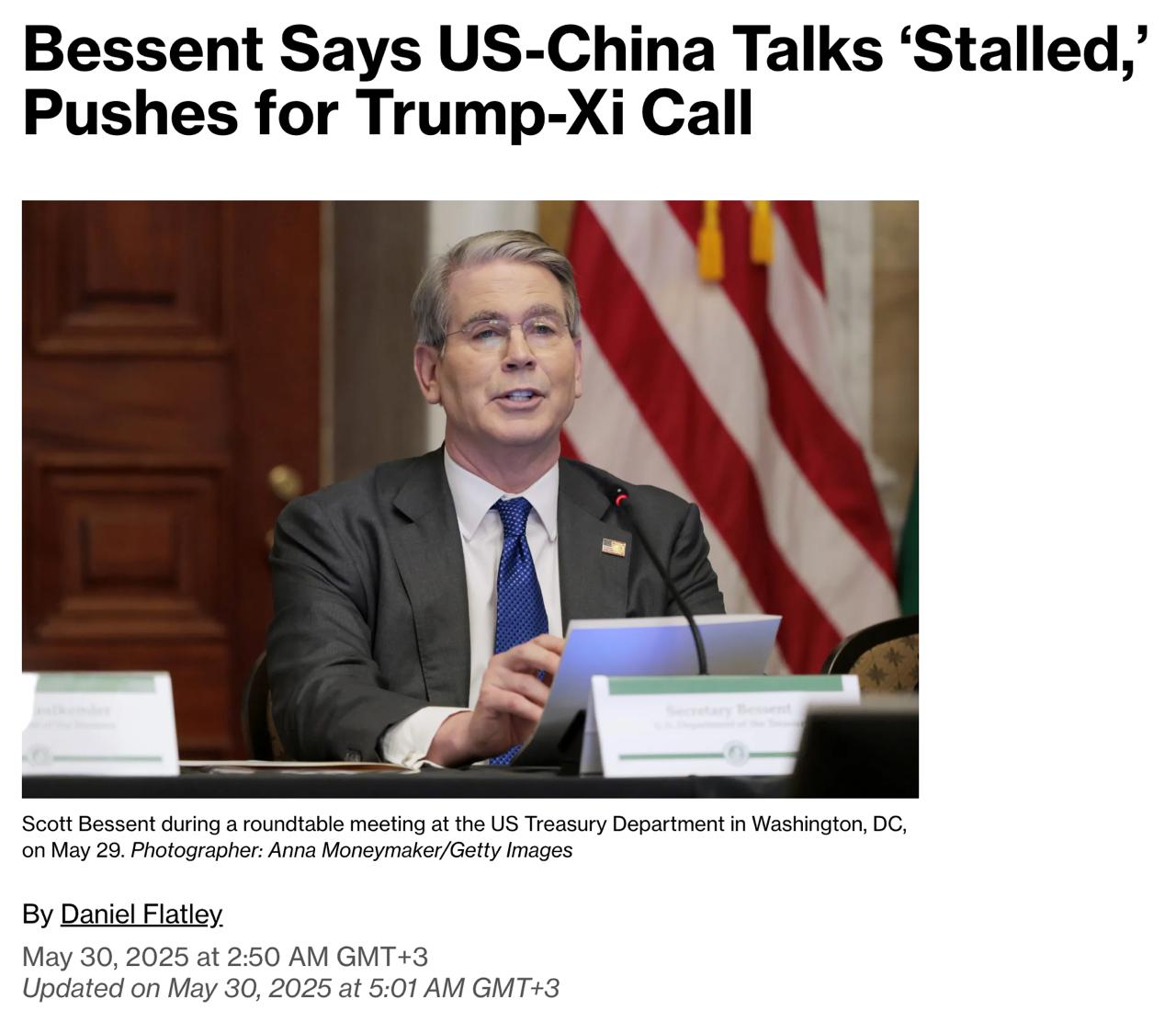 Міністр фінансів США Скотт Бессент заявив, що торгові переговори з Китаєм "трохи зайшли в глухий кут" і що для досягнення угоди потрібна розмова президента США Дональда Трампа і глави КНР Сі Цзіньпіна.